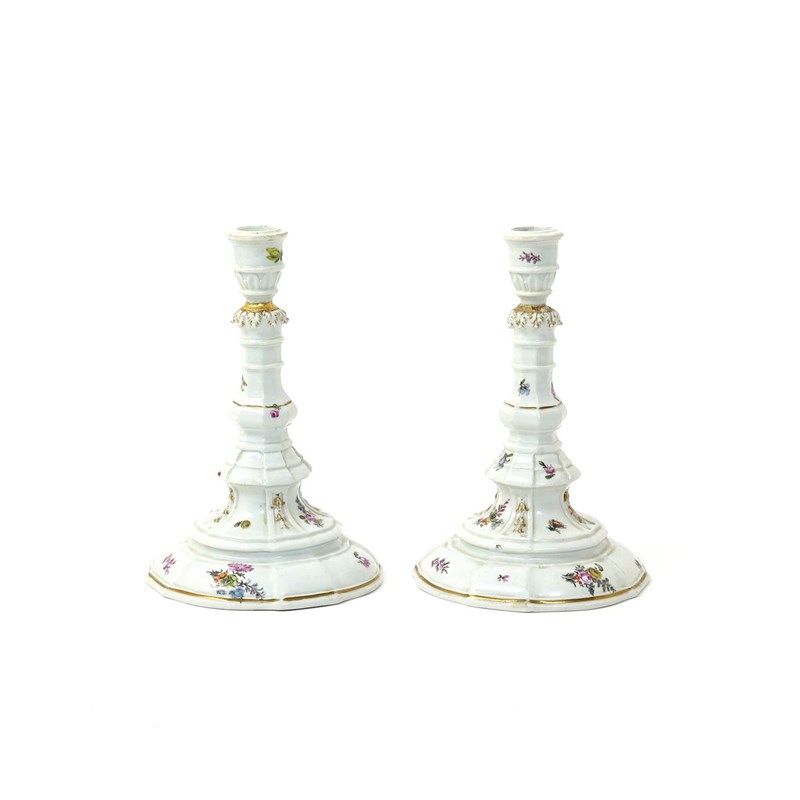 A pair of Meissen candlesticks mid 18th century, of faceted form, the moulded sconces raised on knopped stems above wide stepped feet, painted with small sprays of flowers and single scattered sprigs, applied with a band of gilded leaves around the top of each stem, blue crossed swords mark, one repaired through the neck, 23.5cm. (2)