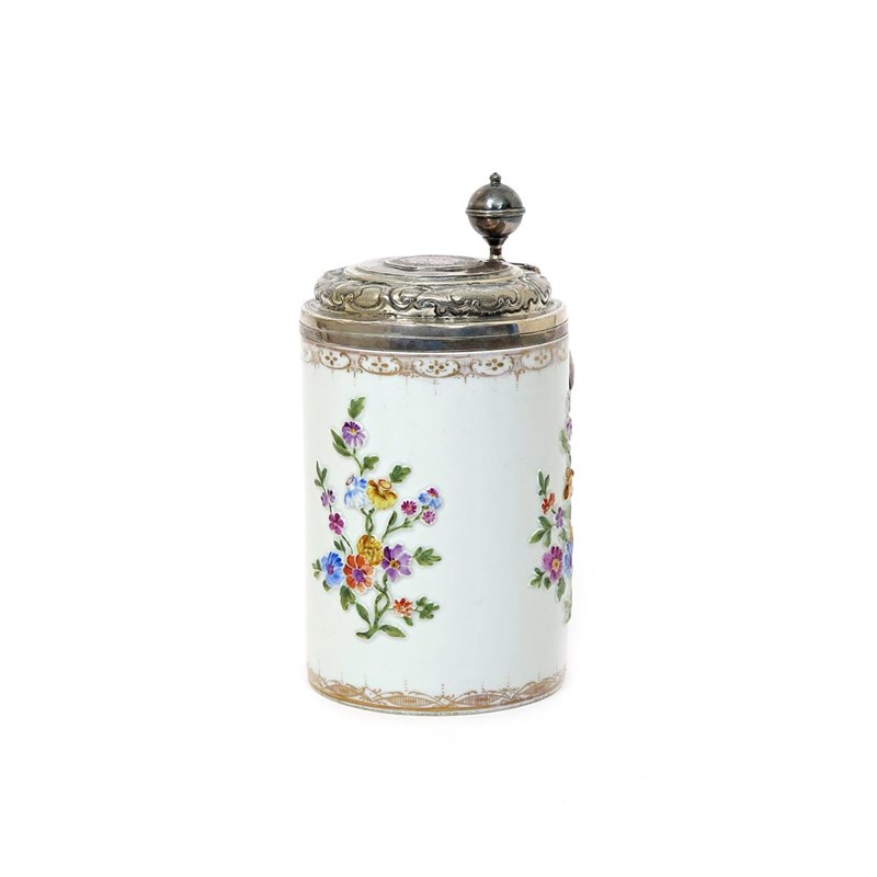 A Meissen tankard 18th century, the cylindrical form with raised decoration of three loose flower sprays, later enamelled and gilt formal borders added, the silver-coloured metal mount set with a copy of a late 16th century coin depicting the three brothers of the German states-Saxony and the date 1593, blue crossed swords mark, 21.5cm.
