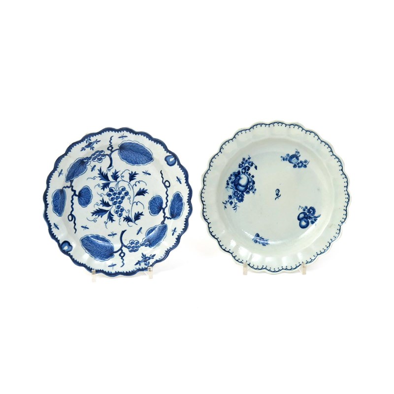 Two Worcester blue and white dessert plates c.1770, one painted with the Rubber Tree Plant pattern, the other printed with the Fruit Sprigs pattern, within scallop-edged rims, four character mark and hatched crescent mark, 19.5cm. (2)