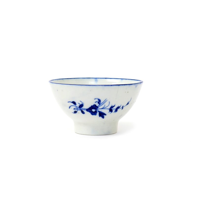 An unusual Caughley blue and white teabowl c.1780-85, the flared shape derived from the Chinese and raised on a tall foot, painted with Chantilly sprigs, a 2.5cm rim crack, 9.6cm dia.