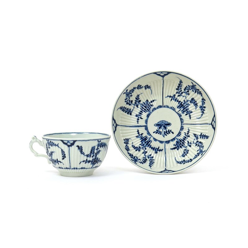A Worcester blue and white teacup and saucer c.1770, of generous reeded form, painted with the Immortelles pattern of sprawling floral tendrils, the cup with a finely moulded scroll handle, open crescent mark, 13.7cm. (2)