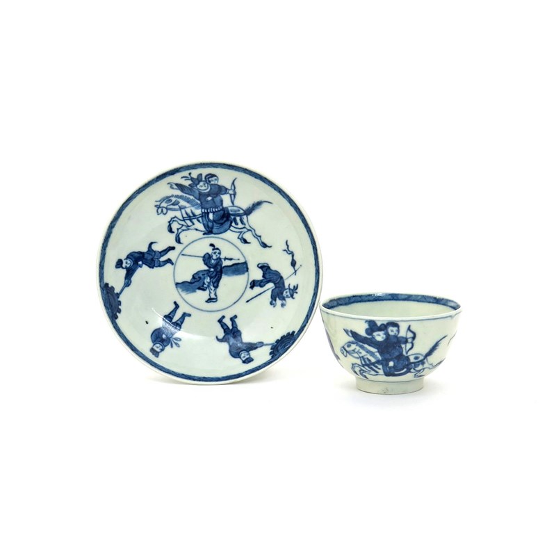 A Worcester blue and white small teabowl and saucer c.1765-70, painted with the Eloping Bride pattern, the fated couple on horseback being chased by four other figures, pseudo Chinese marks, 10.5cm. (2)