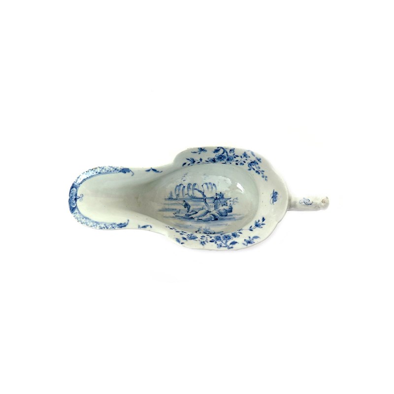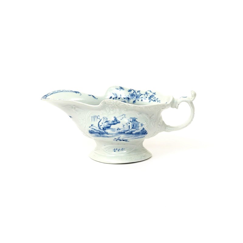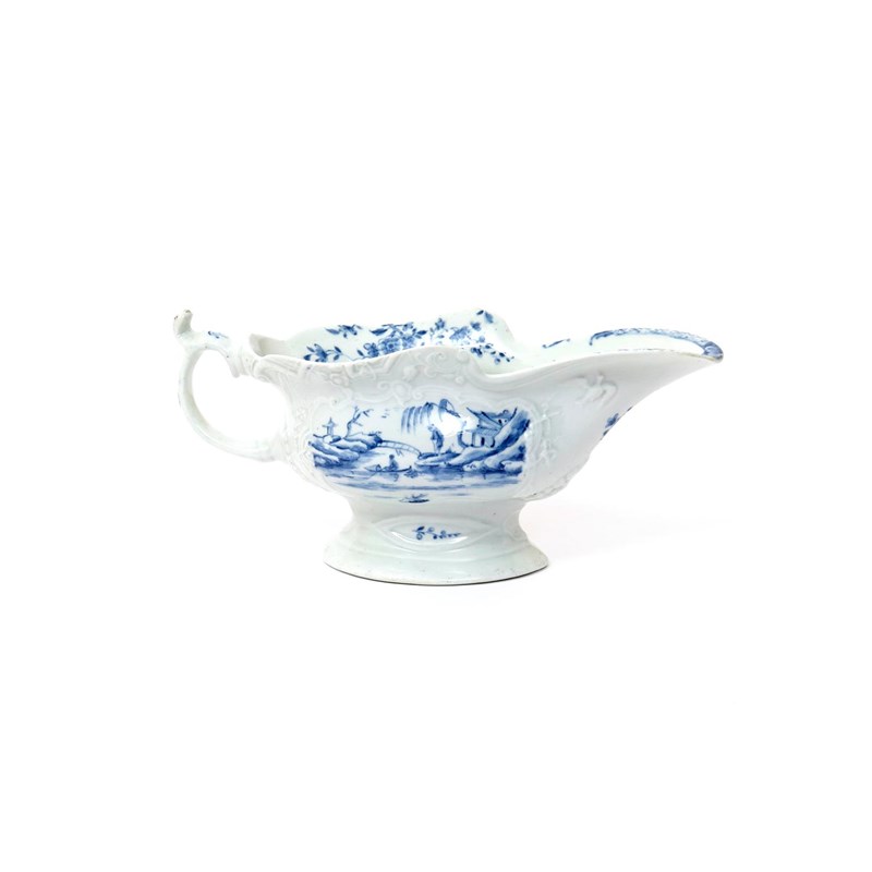 A large Worcester blue and white sauceboat c.1755, painted with the Fisherman on a Towering Rock pattern within moulded panels, the reverse with a figure in a boat beside another standing before a bridge, the interior with a further fisherman, workman's mark, 23.5cm.