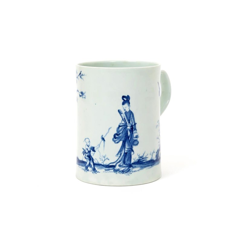 A large Worcester blue and white mug c.1756, the slightly waisted form painted with the Walk in the Garden pattern, with birds perched on a gnarled tree above a boy with a further bird on a long stick and a lady holding a ruyi sceptre, workman's mark, a small filled rim chip, 14cm.