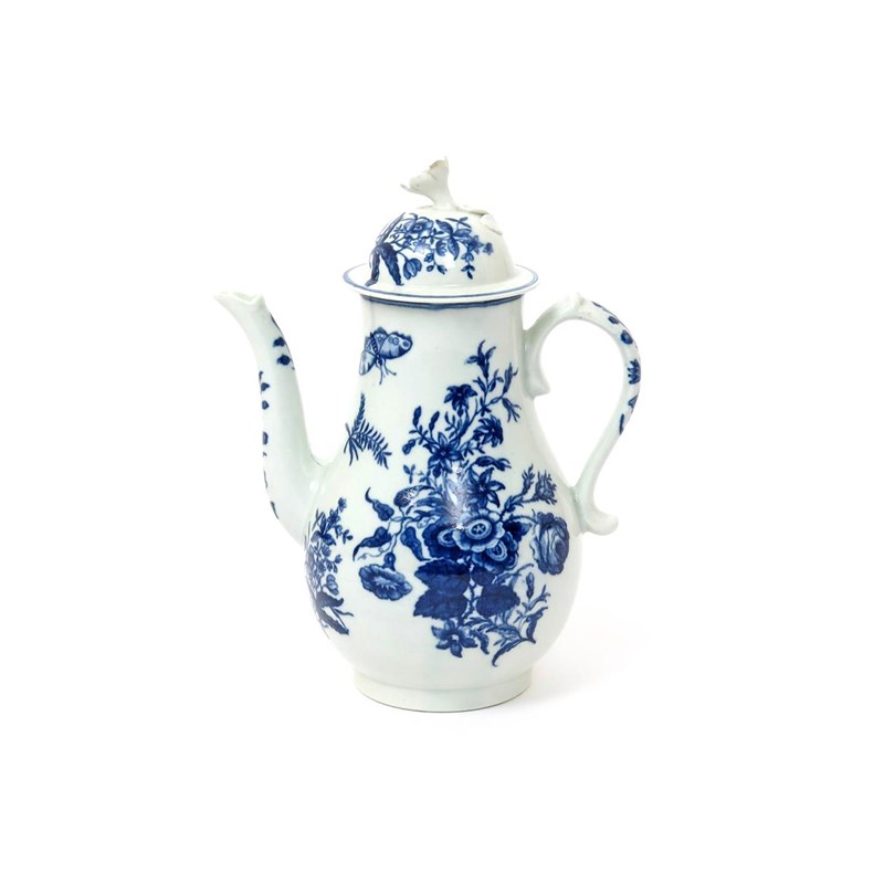 A Worcester blue and white coffee pot and cover c.1770-75, printed with the Three Flowers pattern, a butterfly in flight above, with further flower sprays to the spout, handle and domed cover, hatched crescent mark, tiny nicks to the floral finial, 23cm. (2)