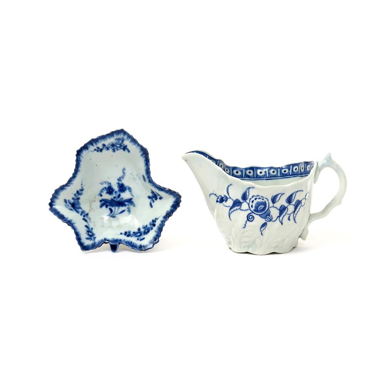 A Worcester blue and white creamboat c.1770-80, of low Chelsea ewer shape, moulded with spiralled leaves and simply painted with a spray of convolvulus, a cell diaper band to inside rim, open crescent mark, and a pickle leaf dish painted with the Pickle Leaf Vine pattern, workman's mark, 11.5cm max. (2)