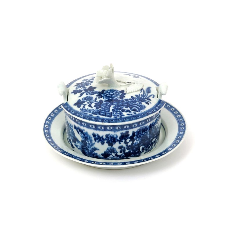 A Worcester blue and white circular buttertub with cover and stand c.1770-75, printed with the Fence pattern, with large flowering peony branches issuing from an ornamental zig-zag fence, the tub with two scroll handles, the cover with an open floral knop, hatched crescent marks, 15.7cm. (3)