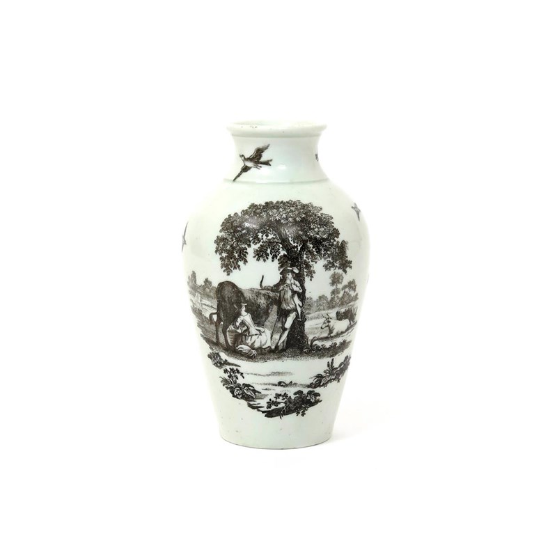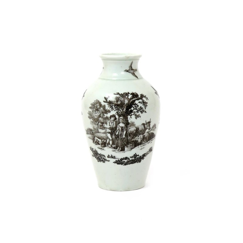 A Worcester baluster vase c.1770, printed in black with Rural Lovers to one side, the reverse with Milking Scene No. 1, with birds in flight between both bucolic scenes and to the neck, 17.5cm.