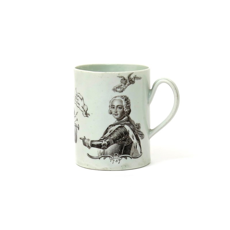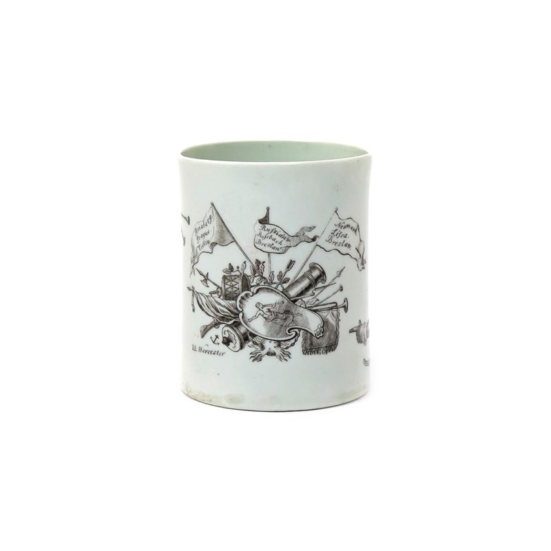 A Worcester small cylindrical mug dated 1757, printed in black with a head and shoulders portrait of the King of Prussia, and a print of Fame blowing a trumpet flanking a vignette of military trophies and flags, signed RH Worcester for Robert Hancock, and with an anchor rebus for Richard Holdship, 8.7cm.