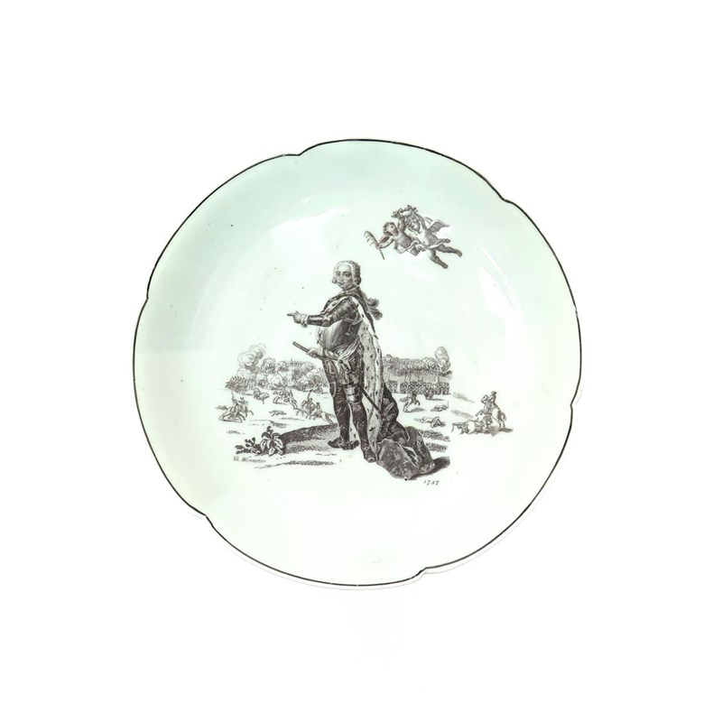 A rare Worcester hexafoil dish dated 1757, printed in black with a full length portrait of the King of Prussia, after a portrait by Antoine Pesne, standing before a battle scene with two putti in flight above, signed RH Worcester for Robert Hancock, 17.5cm.