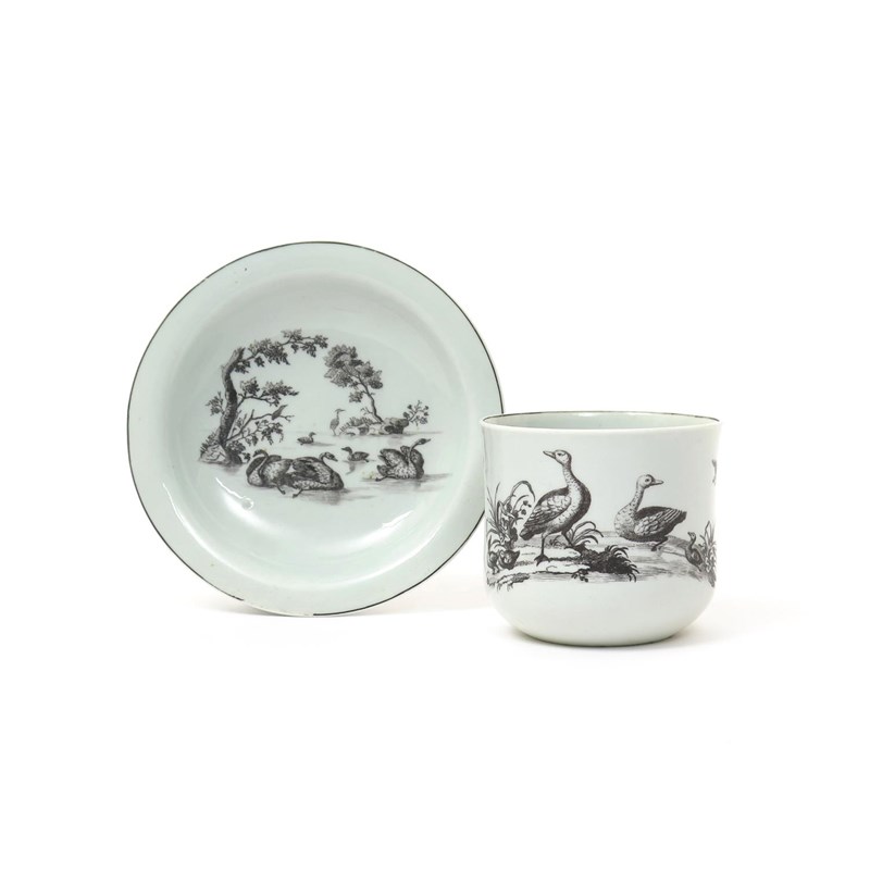 A rare Worcester finger bowl and stand c.1758, printed in black with the River Scene print, with mallard ducks to the bowl, the stand with swans swimming before a kingfisher on a low branch and a standing heron in the distance, a little wear to the black line rim, 14.7cm. (2)