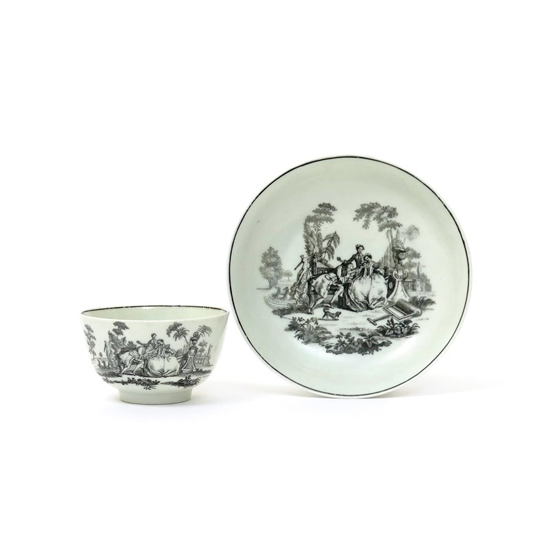 A Worcester teabowl and saucer c.1765, printed in black with L'Amour, a courting couple on a garden bench with a maid chaperoning behind, the well of the teabowl with a single swimming swan, 12.1cm. (2)