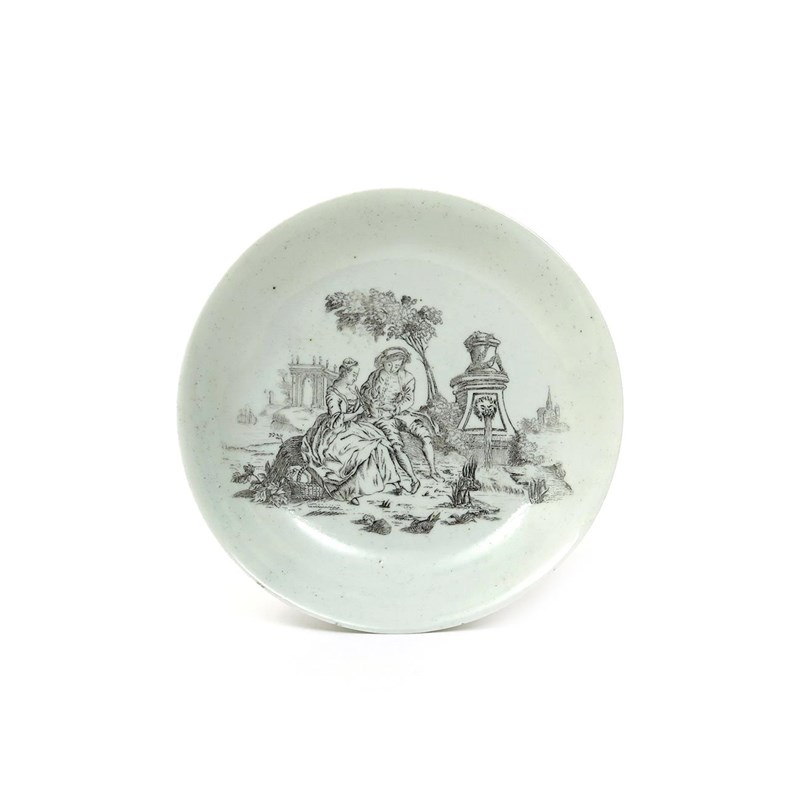 An early Worcester saucer c.1754, printed in black in 'Smoky Primitive' style with The Flute Lesson, a couple seated beside garden statuary and beneath a leafy tree, 12cm.