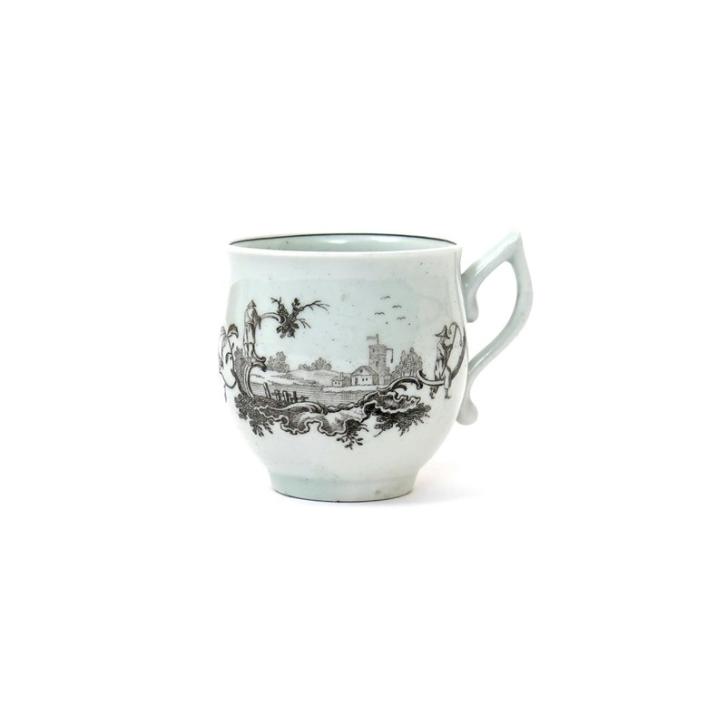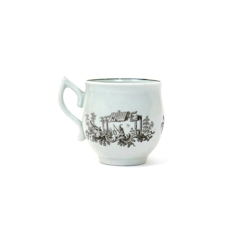 A Worcester bell-shaped coffee cup c.1760-65, printed in black with Les Garçons Chinois, the reverse with a rare print of The Solitary Fisherman, wishbone handle, 6.2cm.