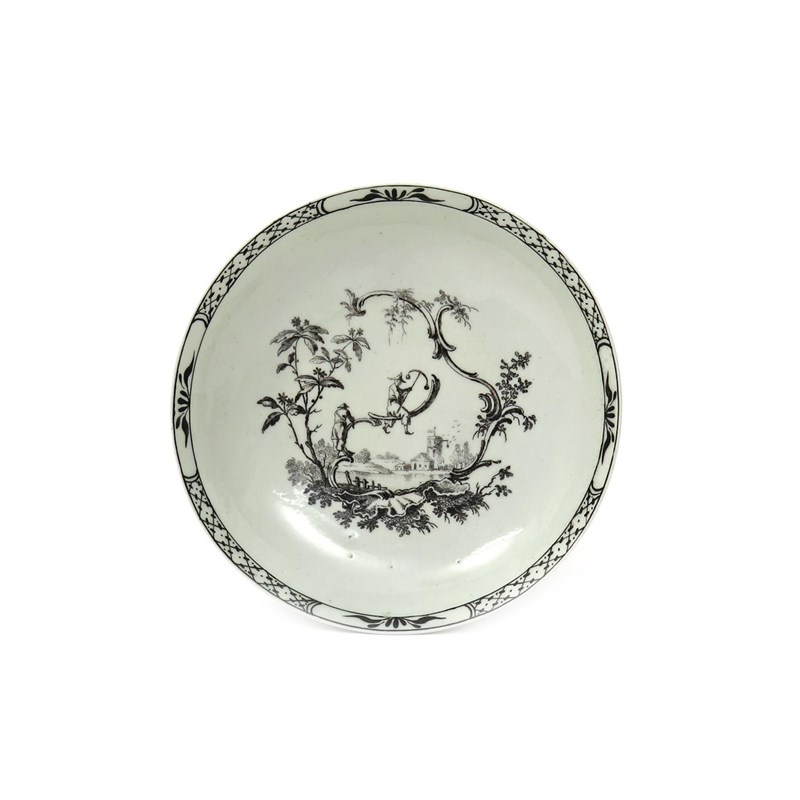 A Worcester saucer c.1760, printed in black with Les Garçons Chinois, two chinoiserie figures clambering over rococo scrolls above a European landscape, the rim painted with a hatched diaper border and simple floral panels, 12cm.