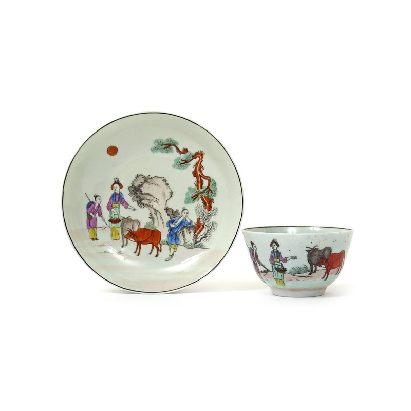 A Worcester teabowl and saucer c.1755-60, printed and coloured with the Red Bull pattern, with Chinese figures standing around the eponymous bovine, 12.1cm. (2)