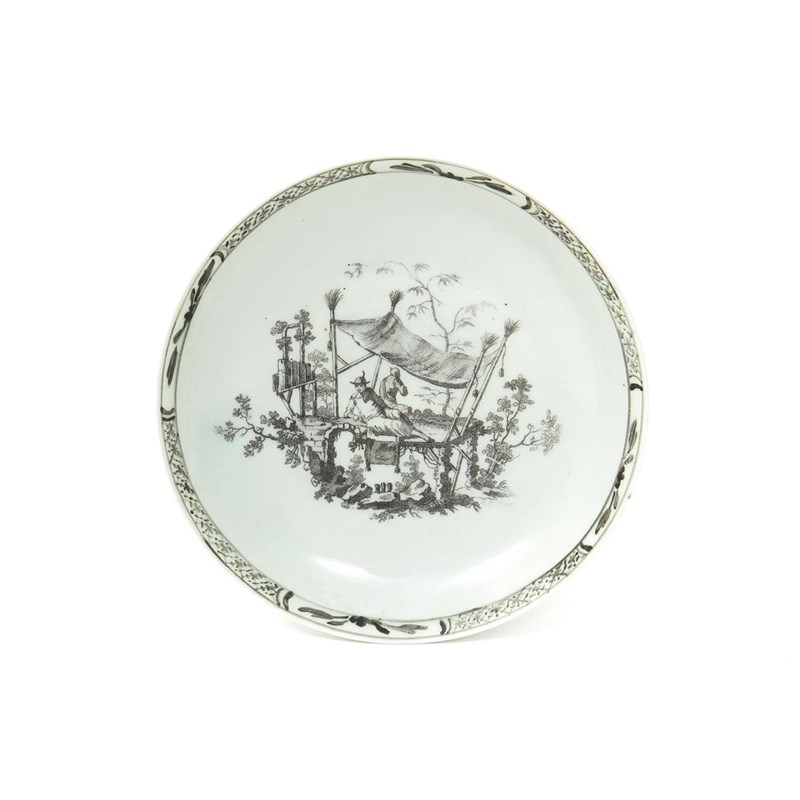 A Worcester saucer c.1758-60, printed in black with La Siesta, a Chinese figure recumbent beneath a tall canopy, with a further figure behind, faintly signed 'RH fecit', the rim painted with a hatched diaper border and four simplistic floral panels, 12cm.