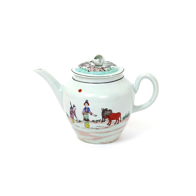 A small Worcester teapot and cover c.1756-60, the baluster-shaped body printed and hand-coloured with the Red Bull pattern, one side with two Chinese figures standing beside the cattle, the reverse with a further figure leaning on rockwork beside a pine tree, with a faceted spout and grooved handle, some nibbling to the end of the spout, a chip to the cover's flange, 16.5cm. (2)