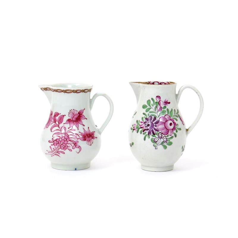 Two Worcester milk jugs c.1765-70, one painted in puce camaieu, possibly in the Giles atelier, with a large flower spray and further single scattered sprigs, the other with pink and purple flowers, the inside rim with puce C scrolls and a gilt band, 9.1cm max. (2)