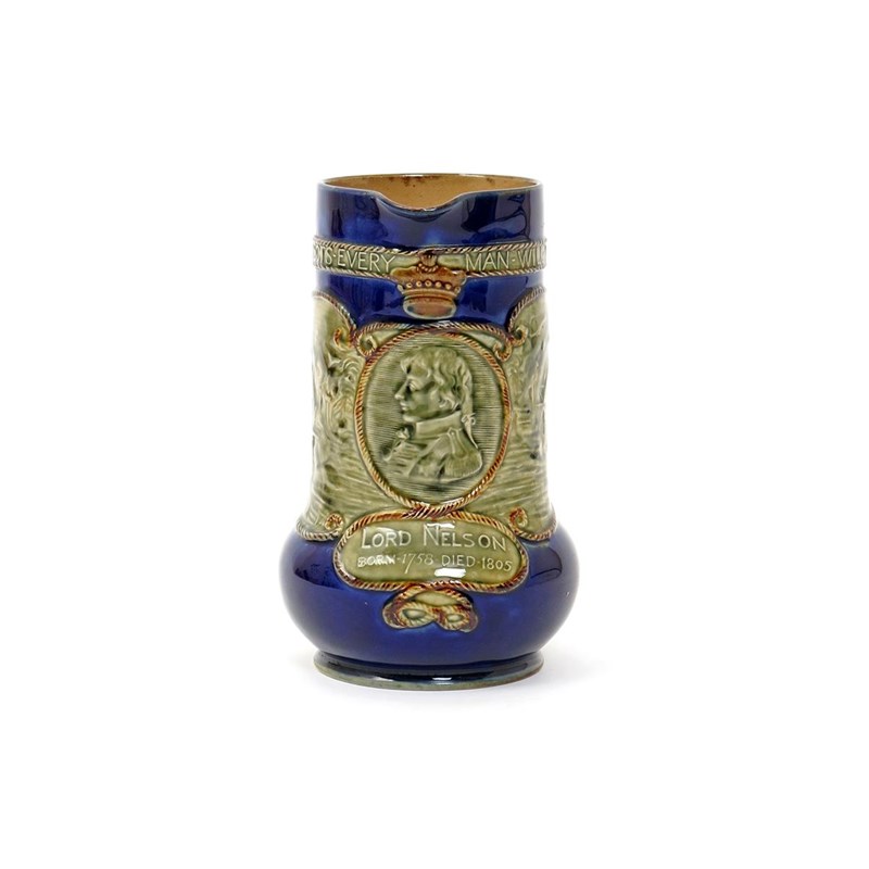 A Royal Doulton stoneware commemorative jug c.1905, moulded in shallow relief with a profile portrait of Lord Nelson against a naval battle scene, above his dates and below the inscription 'England Expects Every Man Will Do His Duty', applied with a ropetwist handle, impressed mark, 19.8cm.