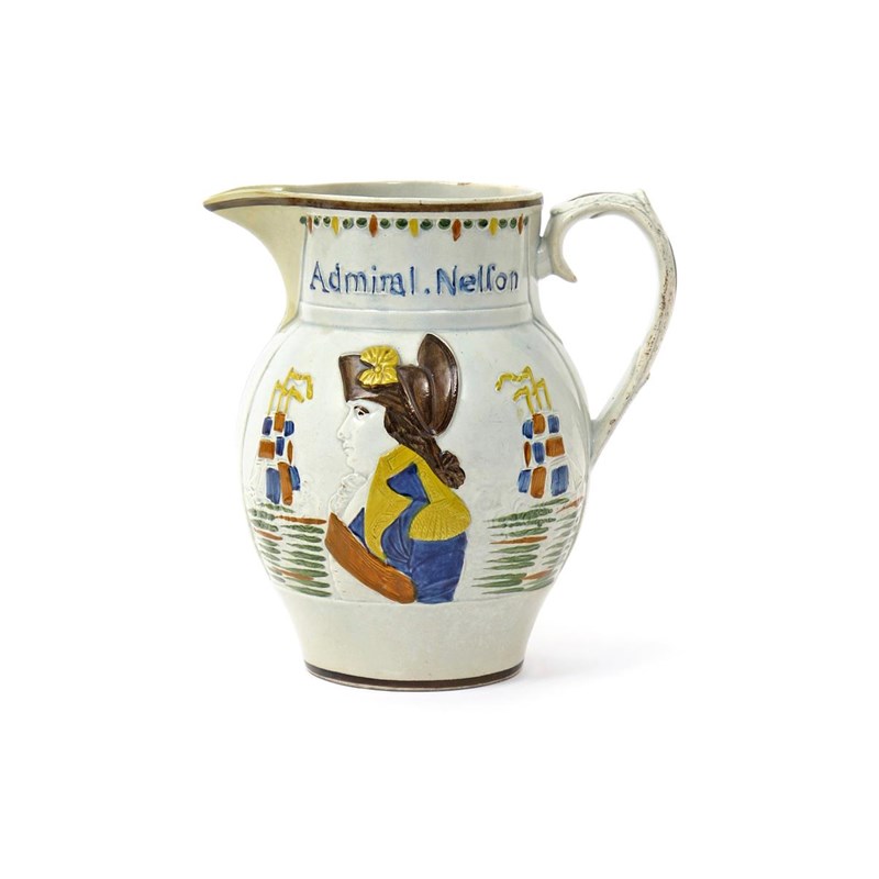 A Pratt ware commemorative jug c.1798, crisply moulded and coloured to one side with a titled profile portrait of Admiral Nelson flanked by two ships, the reverse with a similar portrait of Captain Berry, restoration to the spout, 19.2cm.