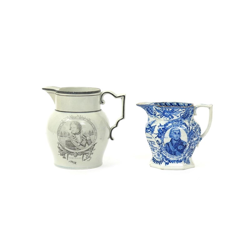 Two pearlware commemorative jugs 1st half 19th century, one printed in black with with a portrait of Admiral Nelson, the reverse with a Classical maiden weeping over the body of a hunter in the woods, the other jug of octagonal form, printed in blue with an oval portrait of Nelson, below the spout listing his various titles, the latter broken and restuck, 14.5cm max. (2)