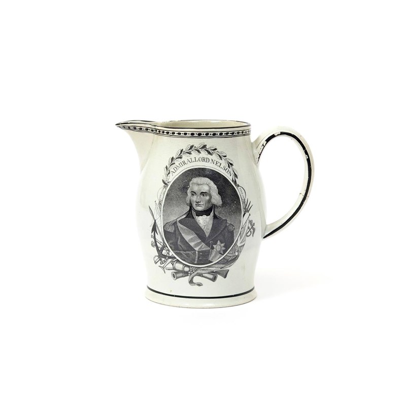 A creamware commemorative jug 1st half 19th century, printed in black with a portrait of Admiral Lord Nelson in an oval panel surrounded by naval motifs, the reverse with Britannia holding a shield and seated beside a lion, a crack to the handle, 15cm.