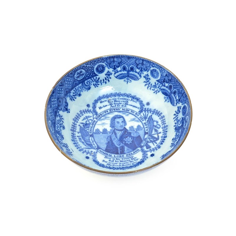 A blue and white commemorative transferware bowl 1st half 19th century, printed to the well with a portrait of Lord Nelson surrounded by naval motifs and an eight line poem, the interior and exterior rims with a Fitzhugh border, 20cm dia.