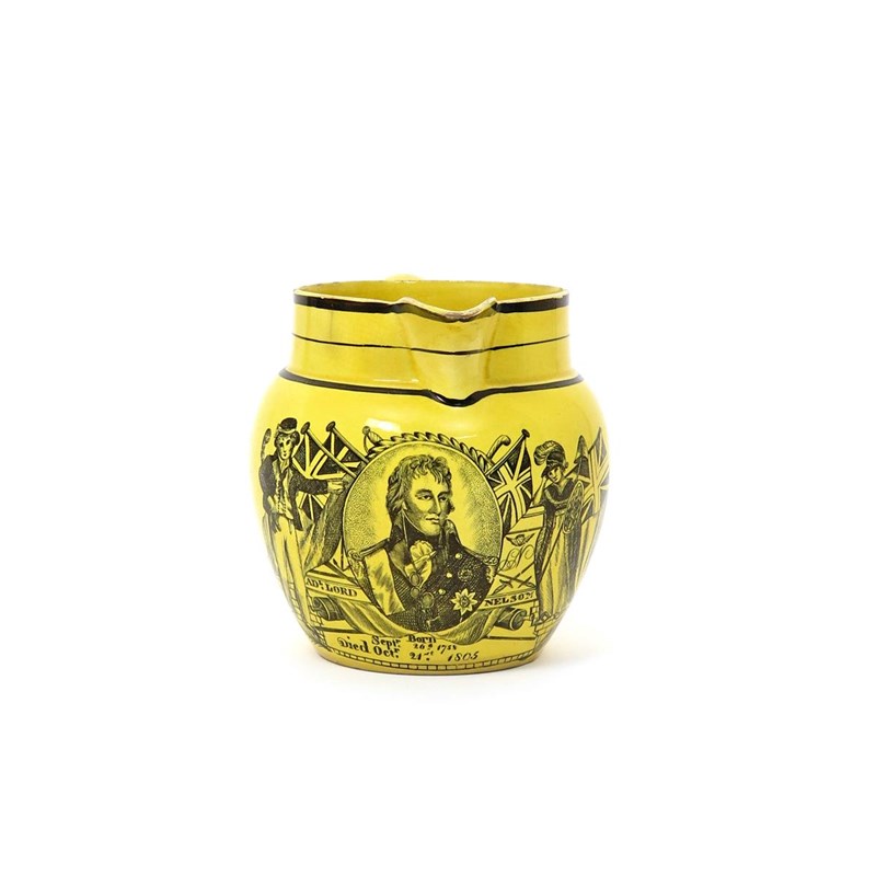 A rare yellow-glazed pearlware commemorative jug 1st half 19th century, printed in black with a portrait of Nelson flanked by a sailor and Britannia beside flags, reserved on a bright canary yellow ground, minor faults, 12.5cm high.