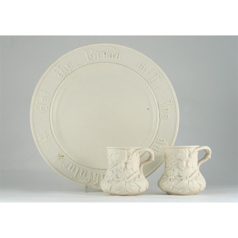 A large Parian dish, probably Goss, inscribed 'Eat thy bread with joy and thankfulness', and a small pair of Copeland mugs moulded with fruiting vines, all 19th century, 32cm. max. (3)