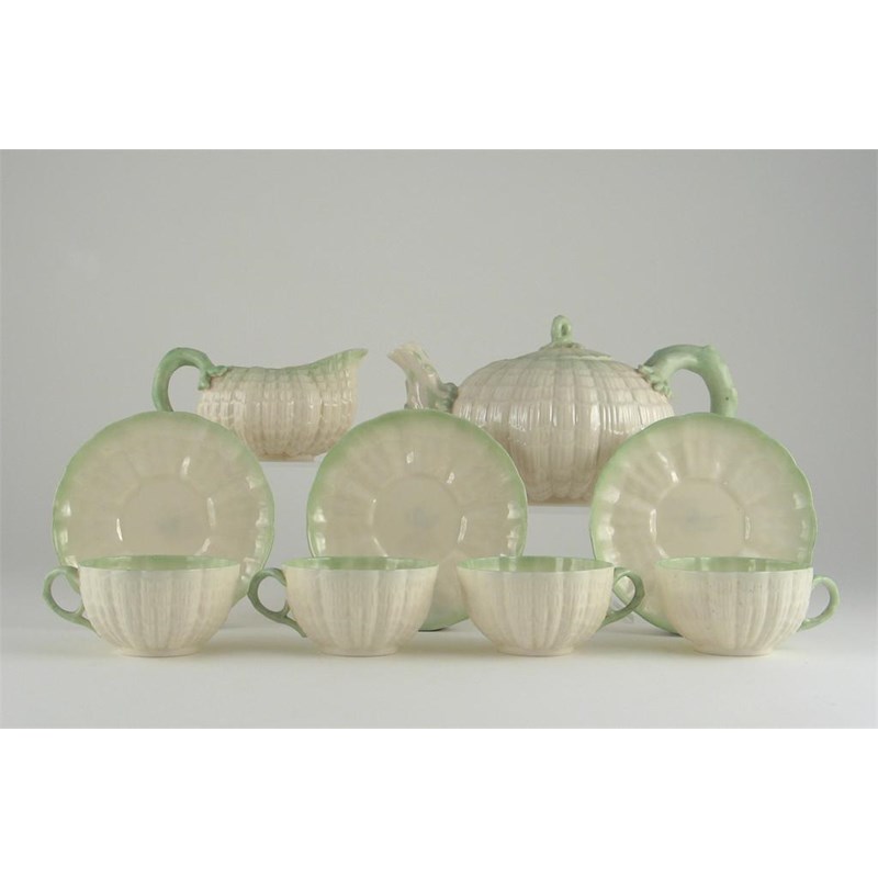 A Belleek Tridacna tea service, the handles and rims decorated with a pale green glaze, black printed marks, early 20th century, 24cm. max. Comprising: a teapot and cover, a milk jug, four cups and six saucers. (13)
