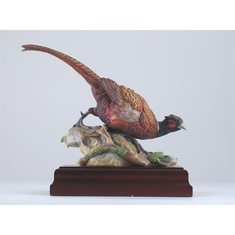 'The Pheasant', a limited edition Coalport model, standing on a naturalistic rocky base, printed marks, no. 107 of 750, c.1979, 30cm. Together with a wood stand and reference sheet. (3)
