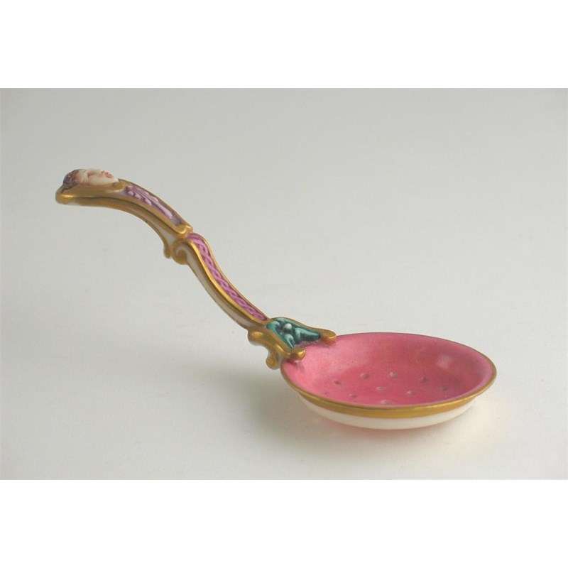 A sifter spoon, the handle moulded with a face, unmarked but probably Royal Worcester, 13cm.