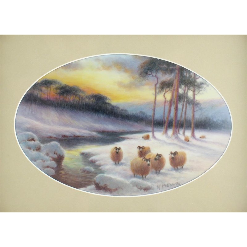 A porcelain oval plaque, painted by Milwyn Holloway, of eight sheep beside a stream in a snowy landscape, framed and glazed, modern, 34cm. overall.
