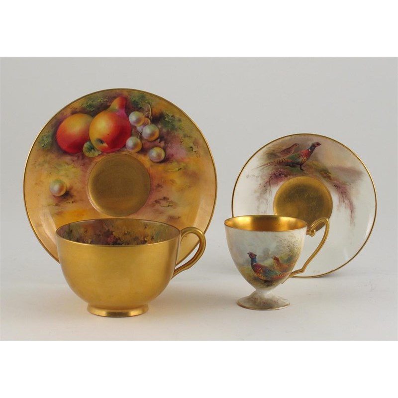 Two Royal Worcester cups and saucers, one painted with fruit, the cup signed 'Townsend', the saucer 'Ayrton', the other painted with pheasants by Stinton. The small cup damaged. Differing dates. (4)
