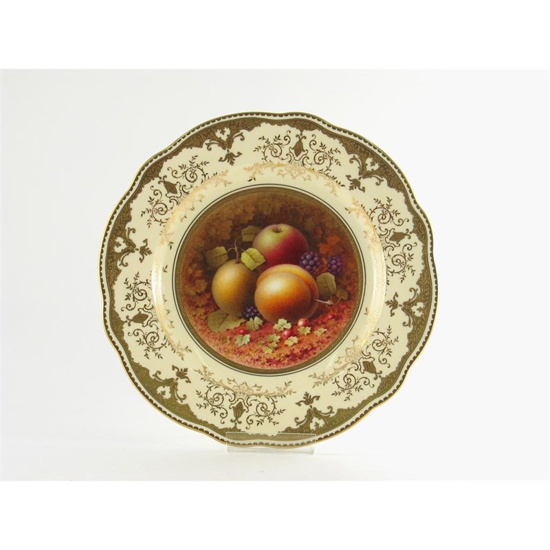 A Coalport plate, the centre painted with a still life of fruit, signed 'Howard', within a raised gilt and pale yellow border, early 20th century, 27cm.