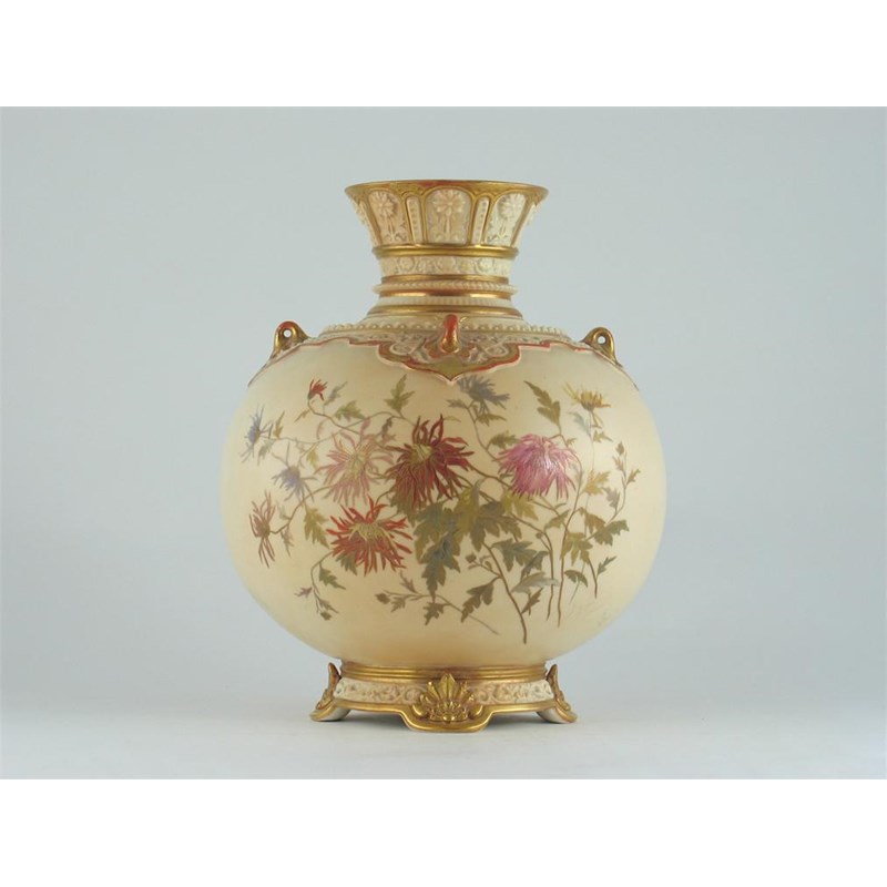 A Royal Worcester globular vase, decorated with wilting chrysanthemums on a blush ground. Some wear to the enamels and gilding. Printed mark with date code for 1890. 28.5cm.
