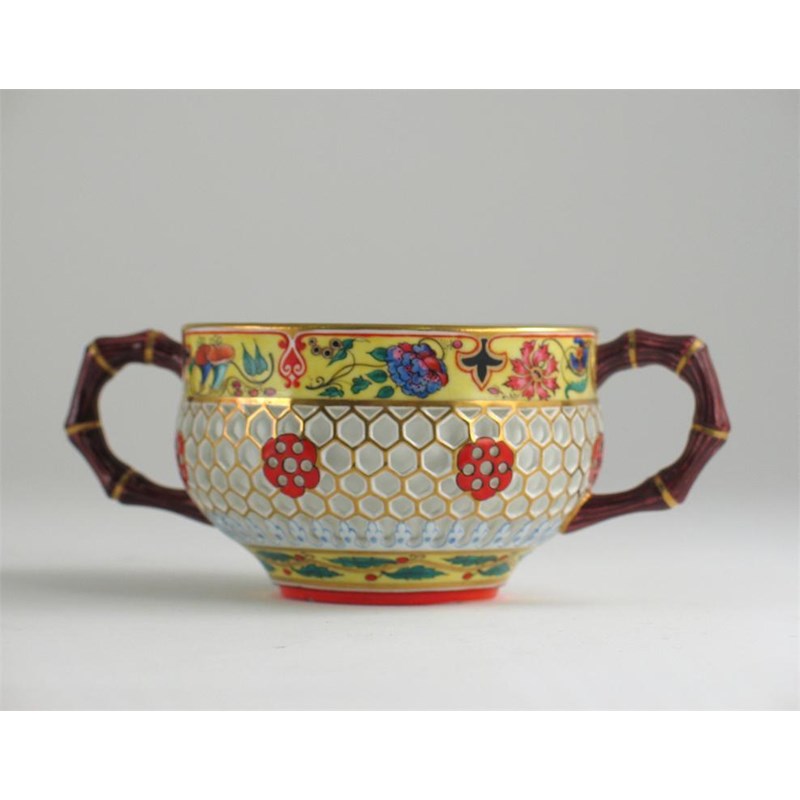 A Chamberlain's Worcester double-walled reticulated sugar bowl, the handles painted as bamboo, painted mark, c.1850, 14cm. Cf. Geoffrey Godden, Chamberlain Worcester Porcelain, p.169 for a similar example.
