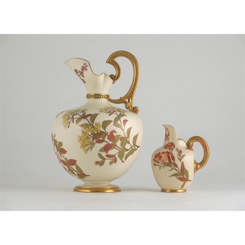 Two Royal Worcester jugs, decorated with flowers on an ivory ground, date codes for 1888 and 1890. A little wear to the gilding. 27cm. (2)