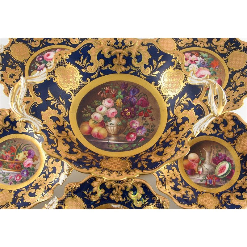 A Ridgway dessert service, painted with flowers and fruit within elaborate gilt moulded borders on a dark blue ground, one with a fake Rockingham mark. Minor damages. c.1851. Comprising: a large tazza, two smaller stands, three serving plates and twelve plates. (18) Cf. Geoffrey Godden, Ridgway Porcelains, p.226.