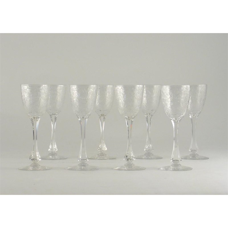 A set of eight wine glasses, the bowls cut with a spiralling floral and garlanded design above a faceted stem. Minor damages. 16.5cm. (8)