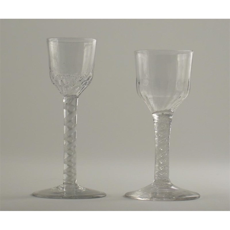 Two wine glasses, with moulded bowls and opaque twist stems, c.1770, 15cm. max. (2)