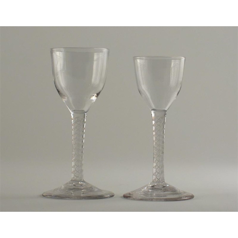 Two wine glasses, with plain bowls and double series opaque twist stems, c.1770, 15.5cm. (2)