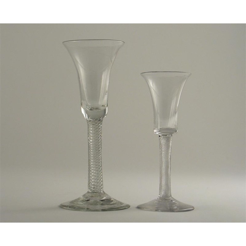 Two wine glasses, with trumpet bowls and air twist stems, 18.2cm max. (2)