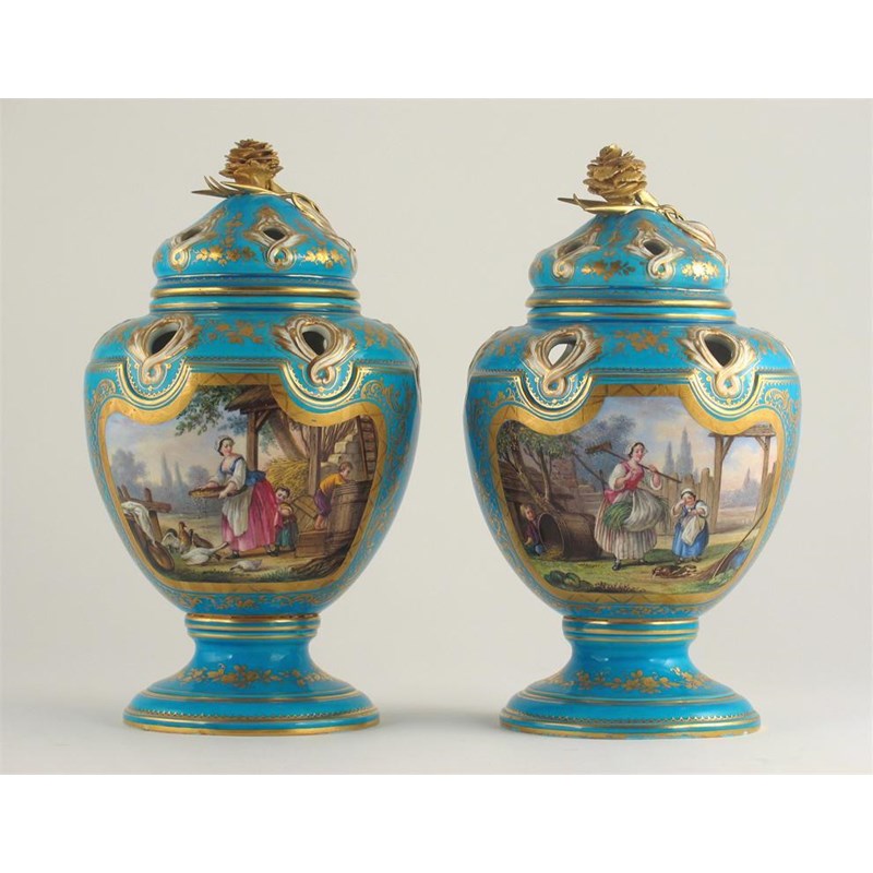 A pair of S?vres-style pot pourri vases and covers, painted with panels of figures and landscapes, each on a gilded turquoise ground, interlaced 'L' marks. Restoration to the knops. 19th century, 25cm. (4)
