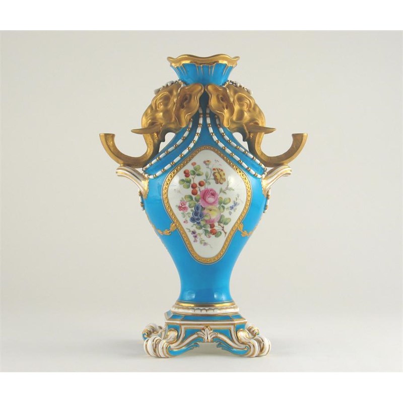A good Minton bone china S?vres-style Duplessis vase, with gilt elephant heads to the neck and painted with two panels, one containing musical instruments, the other with flowers, gold printed, impressed factory marks, date code for 1869, 30.5cm. Cf. Paul Atterbury and Maureen Batkin, The Dictionary of Minton, p.76 for a similar later example.