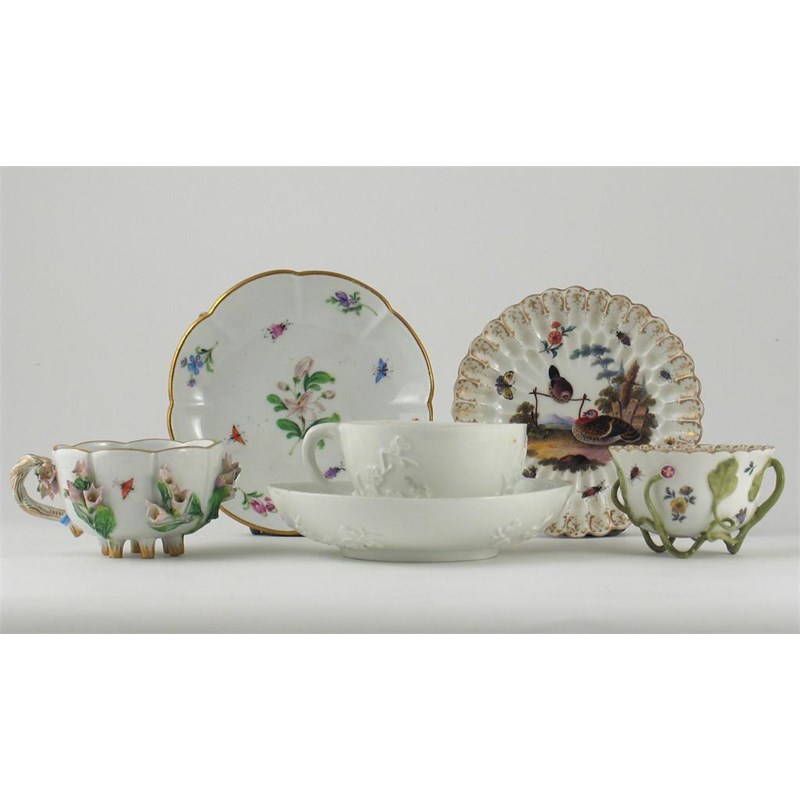Two Meissen teacups and saucers, one applied with prunus, the other with flowers, and a Continental fluted teabowl and saucer supported on curly green stems. Damages and restoration. 18th and 19th centuries. (6)