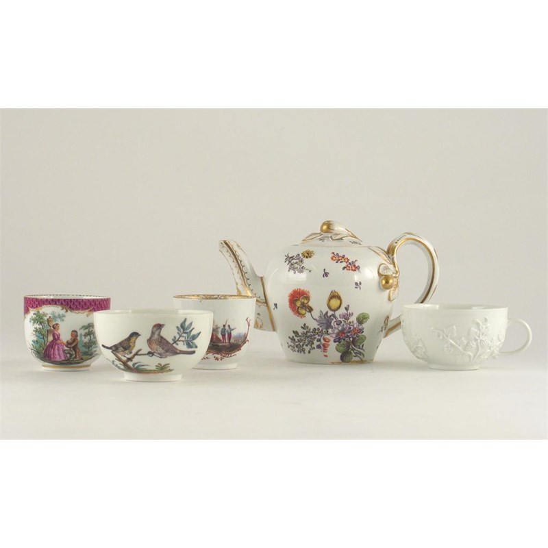Four Meissen cups, variously decorated with figures, birds and moulded prunus, and a floral decorated teapot and cover. Some damages. 18th and 19th centuries, 17.5cm. (6)