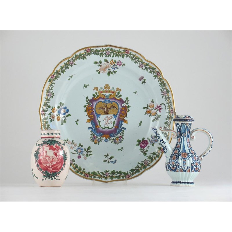 A fa?ence armorial dish, decorated with a floral border, an ewer and cover in the Rouen style and an ovoid vase and cover. Some damage and restoration. All 19th century, 33.4cm. (5)