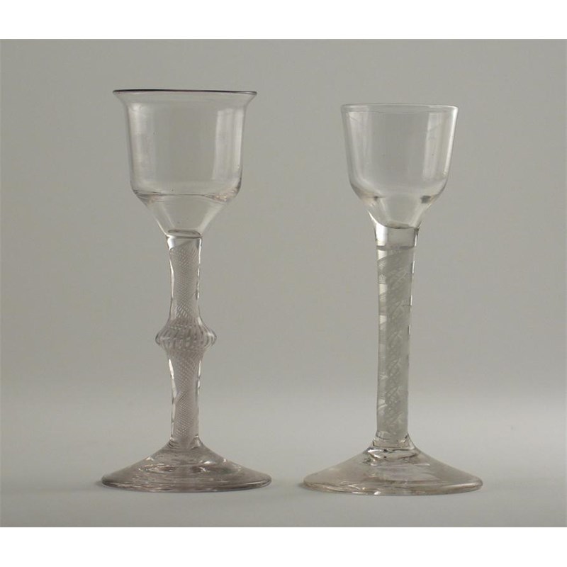 Two wine glasses with plain bowls, one stem knopped, both with opaque twist stems, c.1770, 14.5cm. (2)